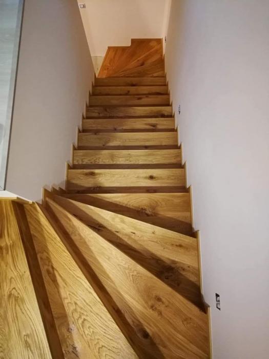 Dřevěné schodiště ve starším rodinném domě patřilo mezi ty krytičtější a bylo velmi nerovné. Ale obložilo se dřevotřískovou deskou, na ní přišla naše dubová rustikální podlaha a výsledek je parádní.