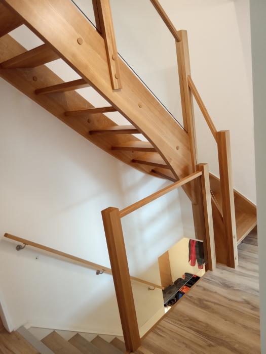 Pan doktor žijící v Norimberku nás požádal o demontáž původního schodiště a montáž nového. Realizováno jako dubové masivní samonosné schodiště s proskleným zábradlím.